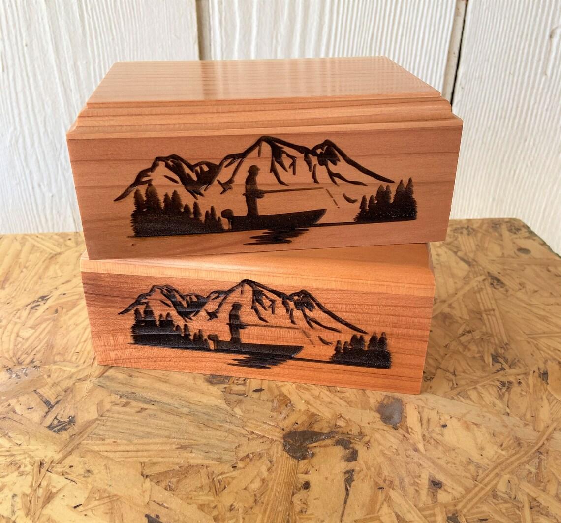 This handmade pet cremation urn set includes two medium-sized urns made of high-quality wood and engraved with a peaceful fishing scene on the front. Customers can also choose the option to personalize the urns with their pet’s name and dates, engraved on the top. The urns feature a bottom-loading design, with a secure bottom panel that is held on with four screws to keep the remains safe. The medium size is ideal for pets weighing up to 33 pounds, with inside dimensions measuring 5 1/2 x 3 1/4 x 2 inches and overall dimensions of 6 1/2 x 4 1/2 x 2 3/4 inches. Please note that each urn is handmade and the grain of the wood chosen may differ from the pictured urn.