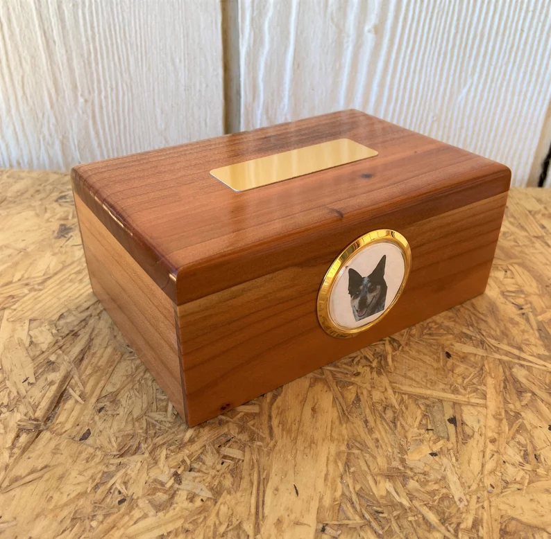 The Medium Redwood Pet Cremation Urn with Brass Plaque and Picture Frame is a beautifully designed product that provides a personalized and dignified way to remember your beloved pet. Handmade with care, this urn has a gold-framed picture insert and an engraved brass plaque on the top, all included in one great price.