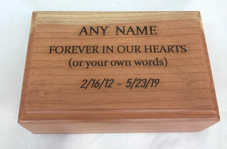 This Personalized Engraved Medium Wood Pet Cremation Urn is a beautiful and timeless resting place for your beloved pet’s remains. Handmade with care by a craftsman in Arizona, this urn is made from high-quality redwood. The urn has a stunning and unique grain pattern that varies from piece to piece, making each one special and one-of-a-kind.