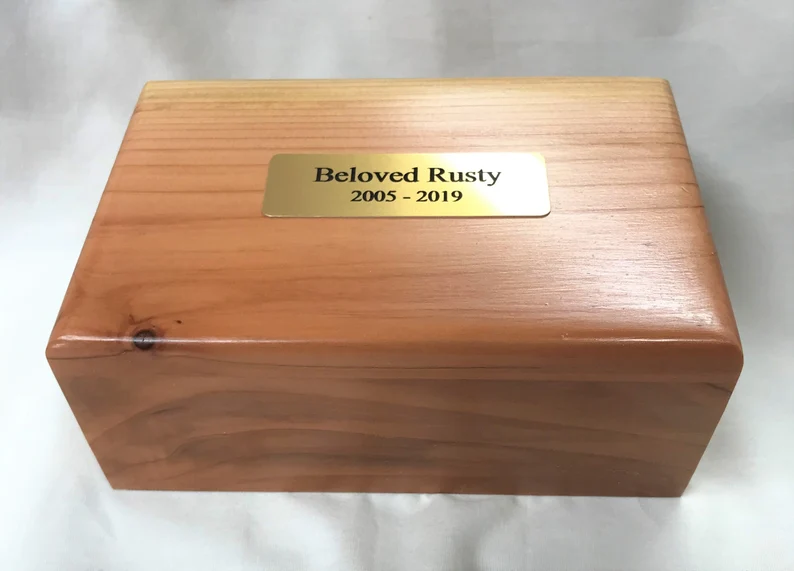This handmade Personalized Medium Pet Cremation Urn combines an elegant redwood design with a laser engraved brass plaque to create a beautiful and personal tribute to your beloved pet. The attention to detail is evident in each urn, as they are crafted one at a time with thoughtfully selected wood.