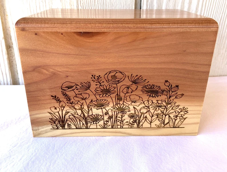 Each cremation urn is meticulously crafted by hand and finished with a high-quality polyurethane coating, ensuring durability and longevity. The custom wild flower nature scene is engraved and carved with care and precision, providing a beautiful and detailed tribute to a loved one.