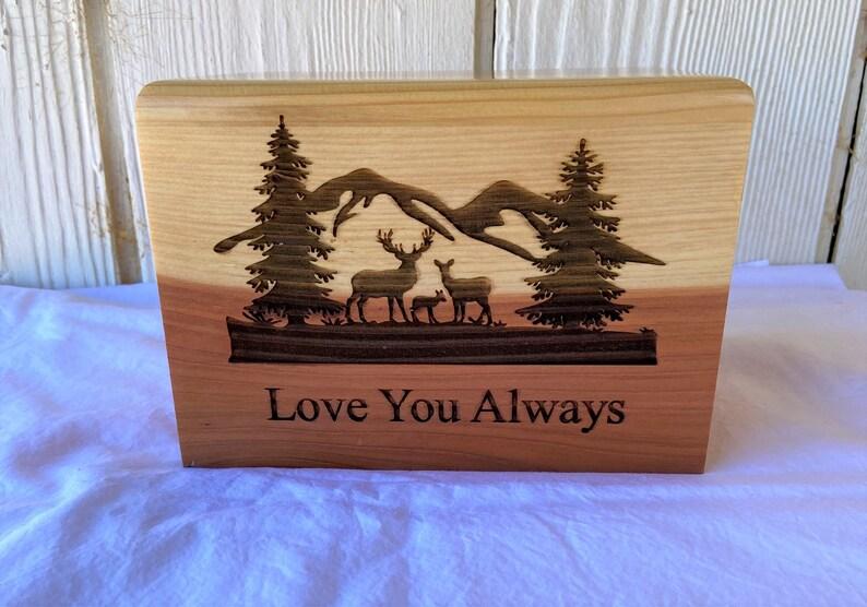 Honor and remember your loved one with the beautiful Small Adult Wood Cremation Urn with wilderness and deer engraving. Order now and take advantage of the optional add-on for personalized laser engraving on the top to make it a truly unique and special keepsake.